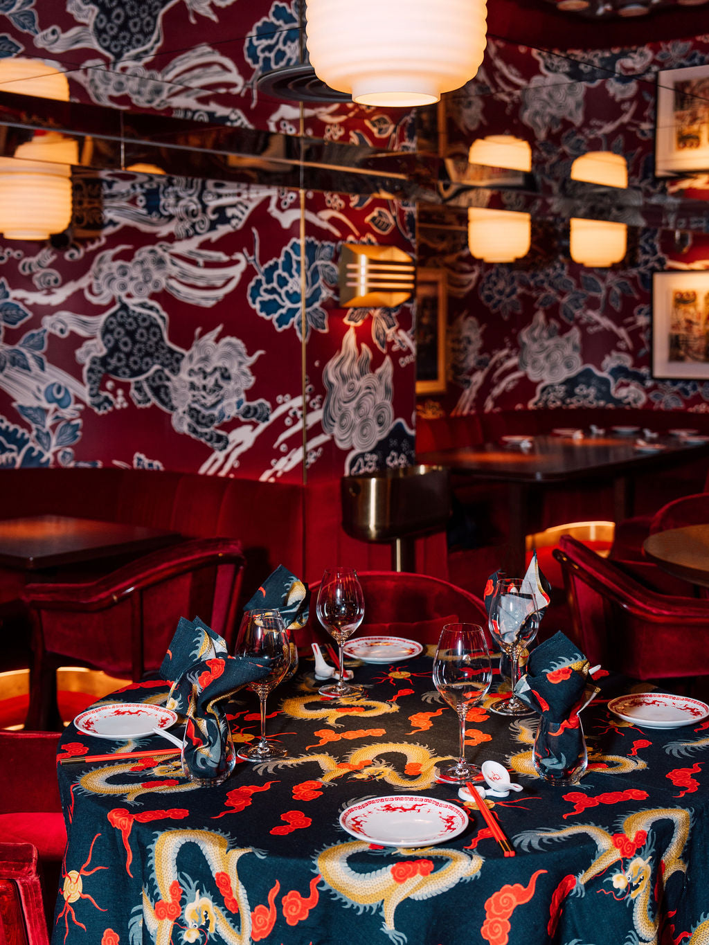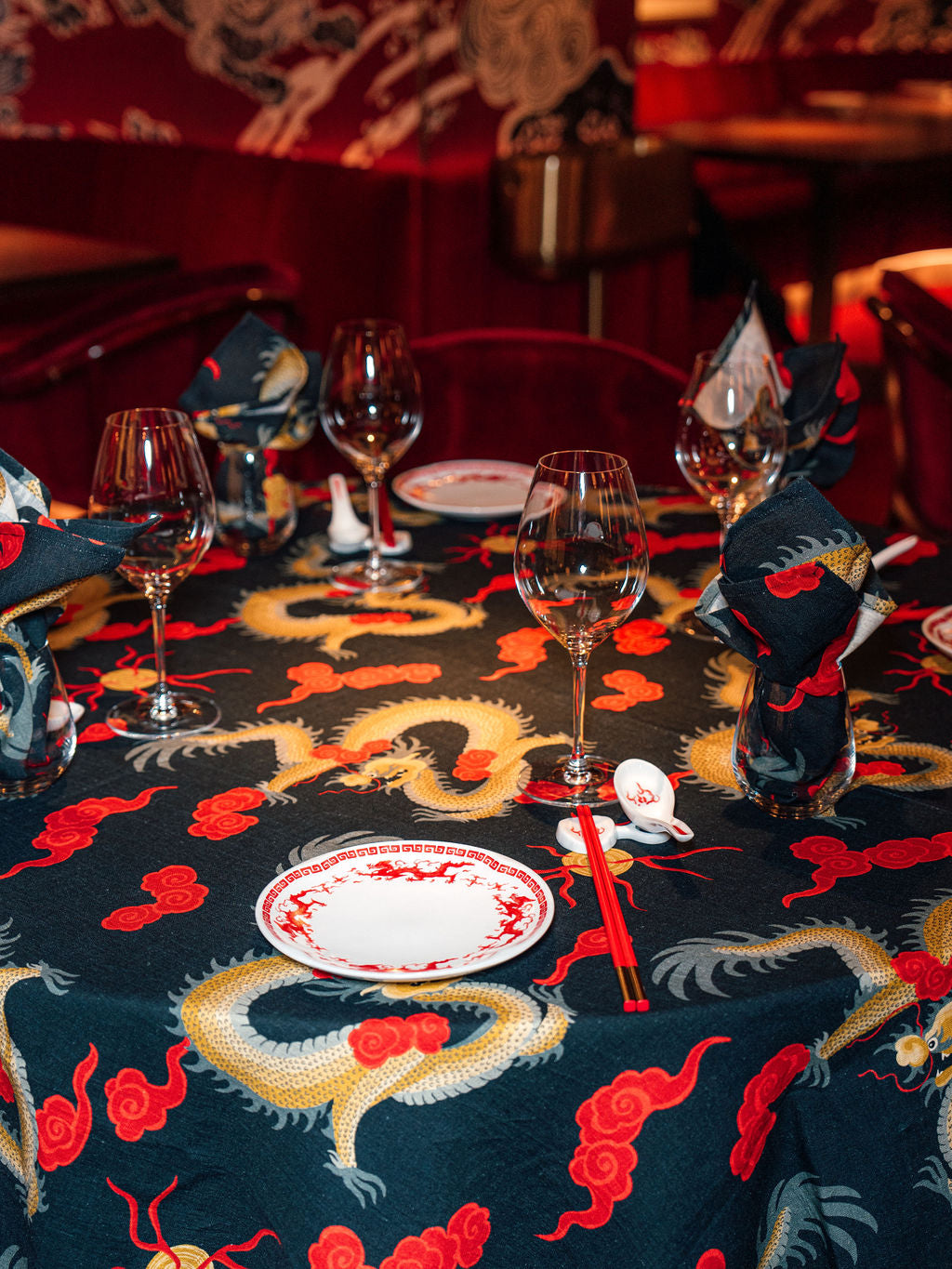 Introducing our Kowloon table linens collection, a pattern designed to delight you and your family and loved ones as you gather around the table this Lunar New Year. This original motif takes inspiration from a vintage silk garment we discovered featuring a particularly majestic dragon and from the robes in the permanent collection of Hong Kong's Palace Museum. The reimagined 'golden' ombré and 'silver' tipped dragons are set against a heathered onyx background and surrounded by red clouds and 'golden' and red flaming pearls. We were lucky enough to photograph the collection at Ho Lee Fook - our favorite Cantonese insipired dining spot in Soho, Hong Kong. After the shoot, we had to stay for the Australian Lobster with Cheesy Sauce, Seaweed Butter and E-Fu Noodles - a warm-up for the Yi Mien or longevity noodles we will eat for the new year.