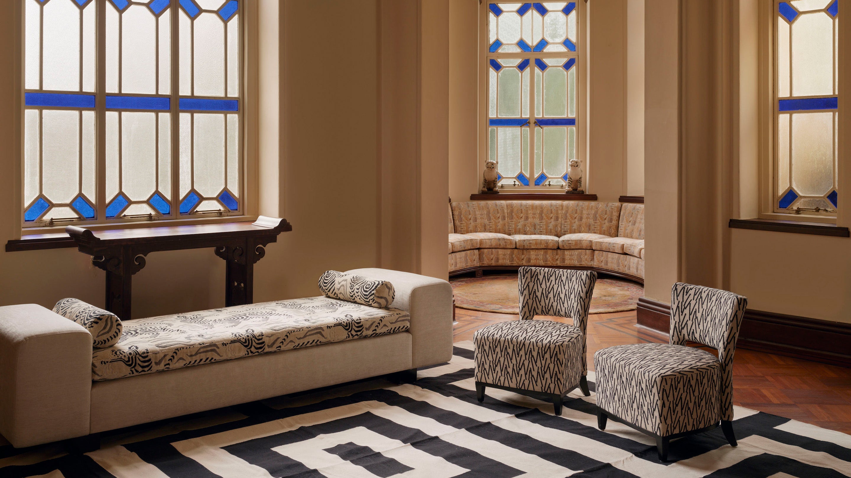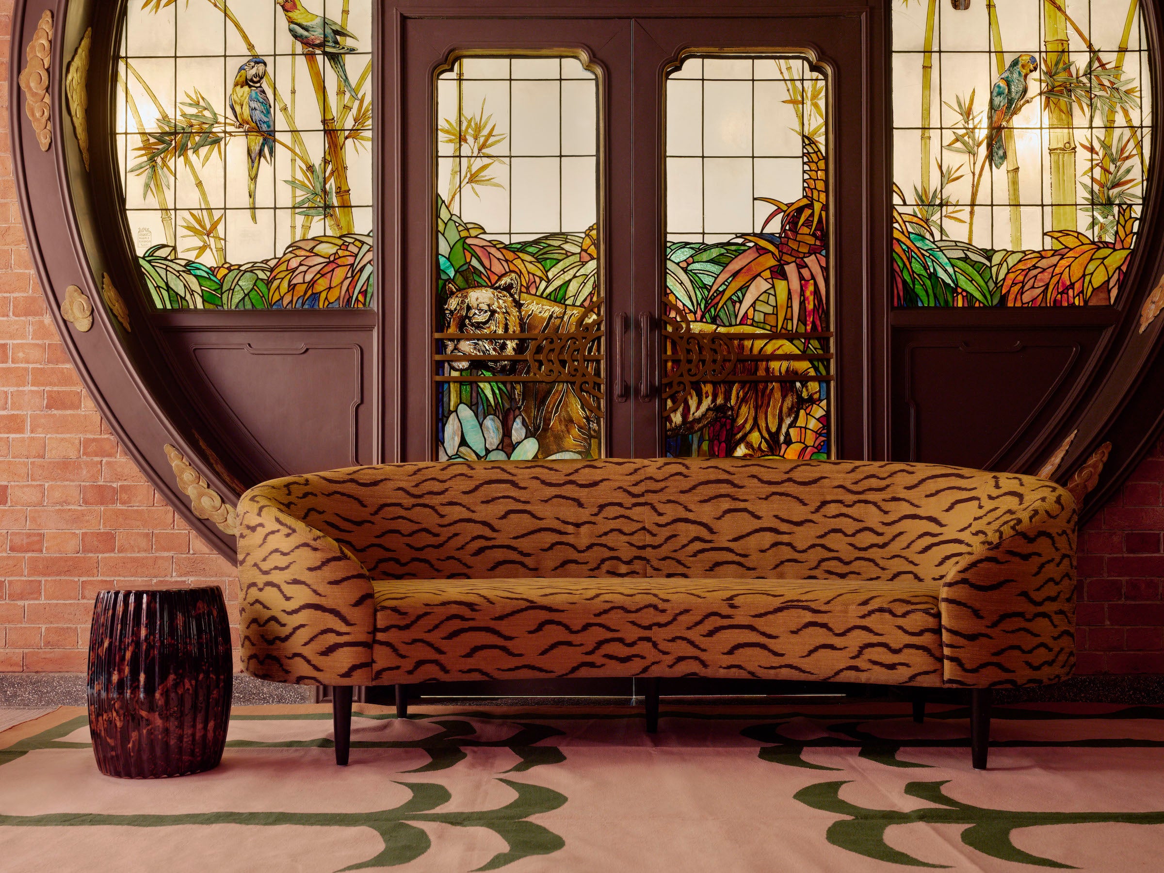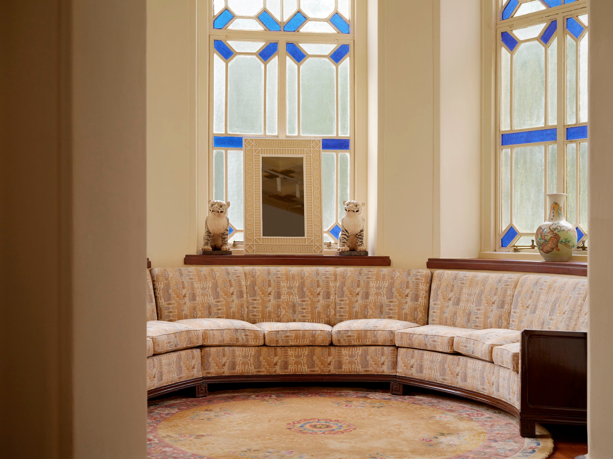 The original entrance to the home features a spectacular moon gate, depicting none other than a tiger. A moon gate is a circular opening in a garden wall that acts as a pedestrian passageway and is a traditional architectural element in Chinese gardens. It provides an auspicious welcome to guests and a returning point for family members. We couldn't help but pair it with our tiger print Selma Sofa. The stained glass is signed G. Tolleri, Florence, Italy.