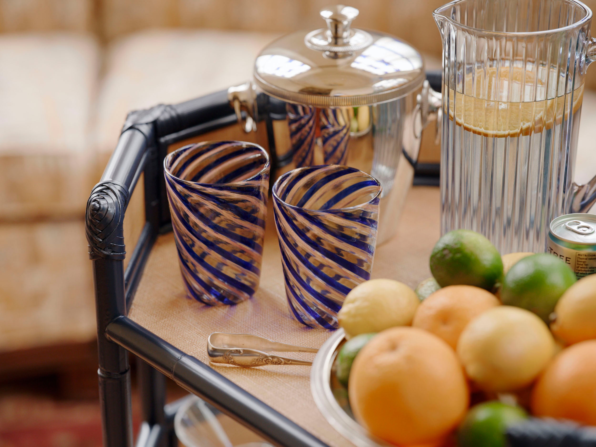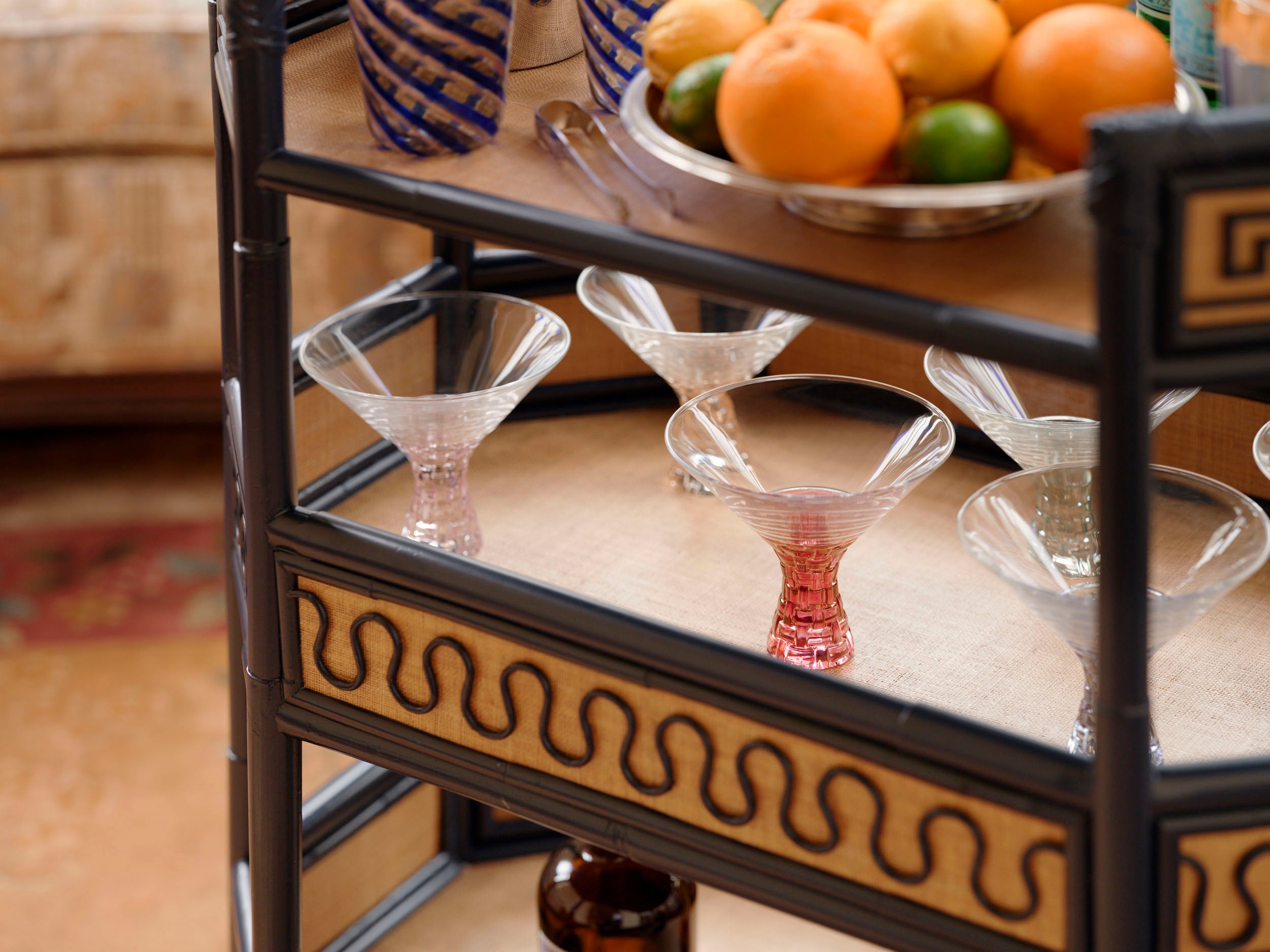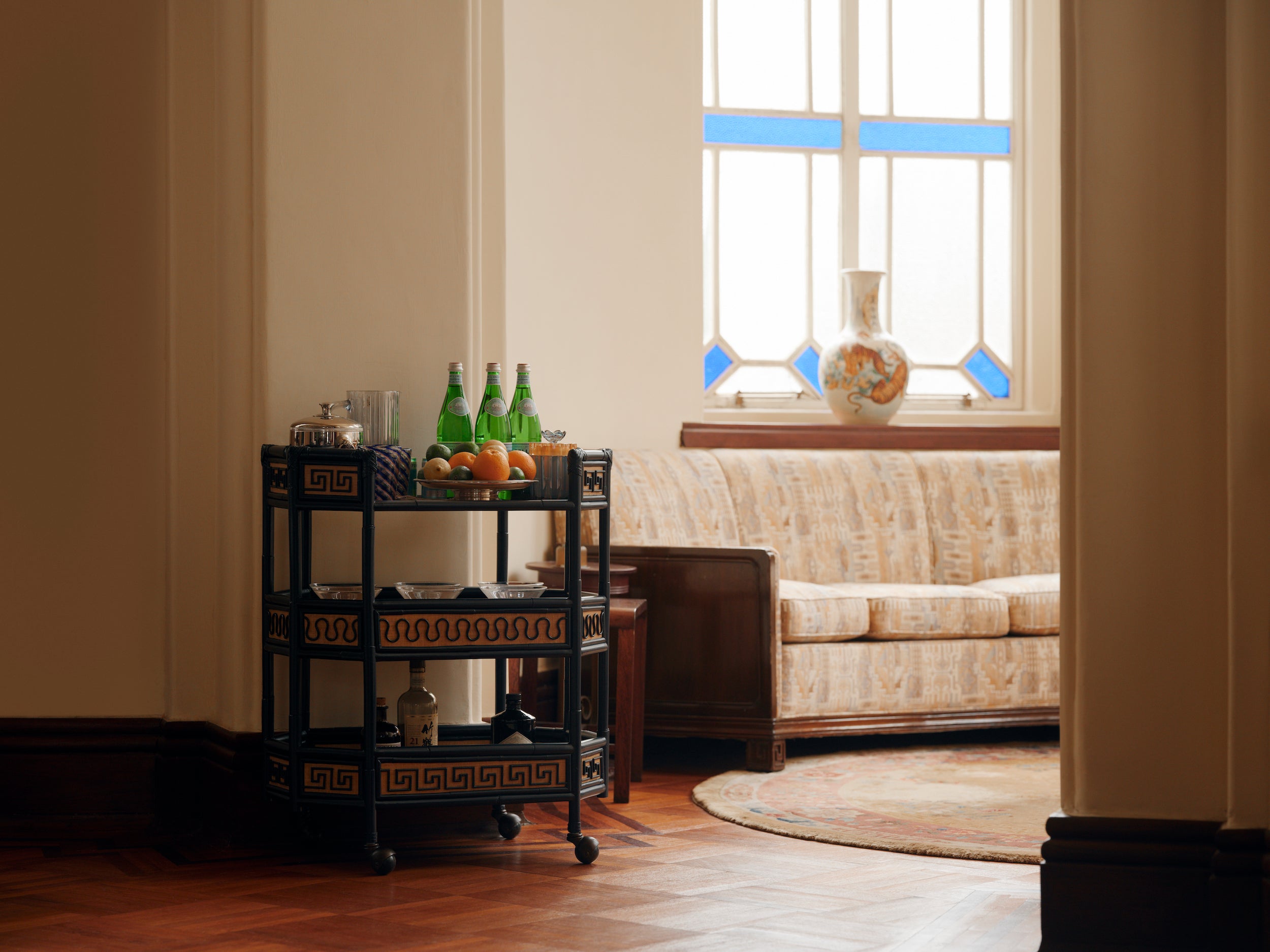 Adjoining the dining room is a circular smoking lounge, which seemed like a natural fit for our Belvedere Bar Cart. The round silk carpet, vases, and ceramic tigers featured are original to the mansion.