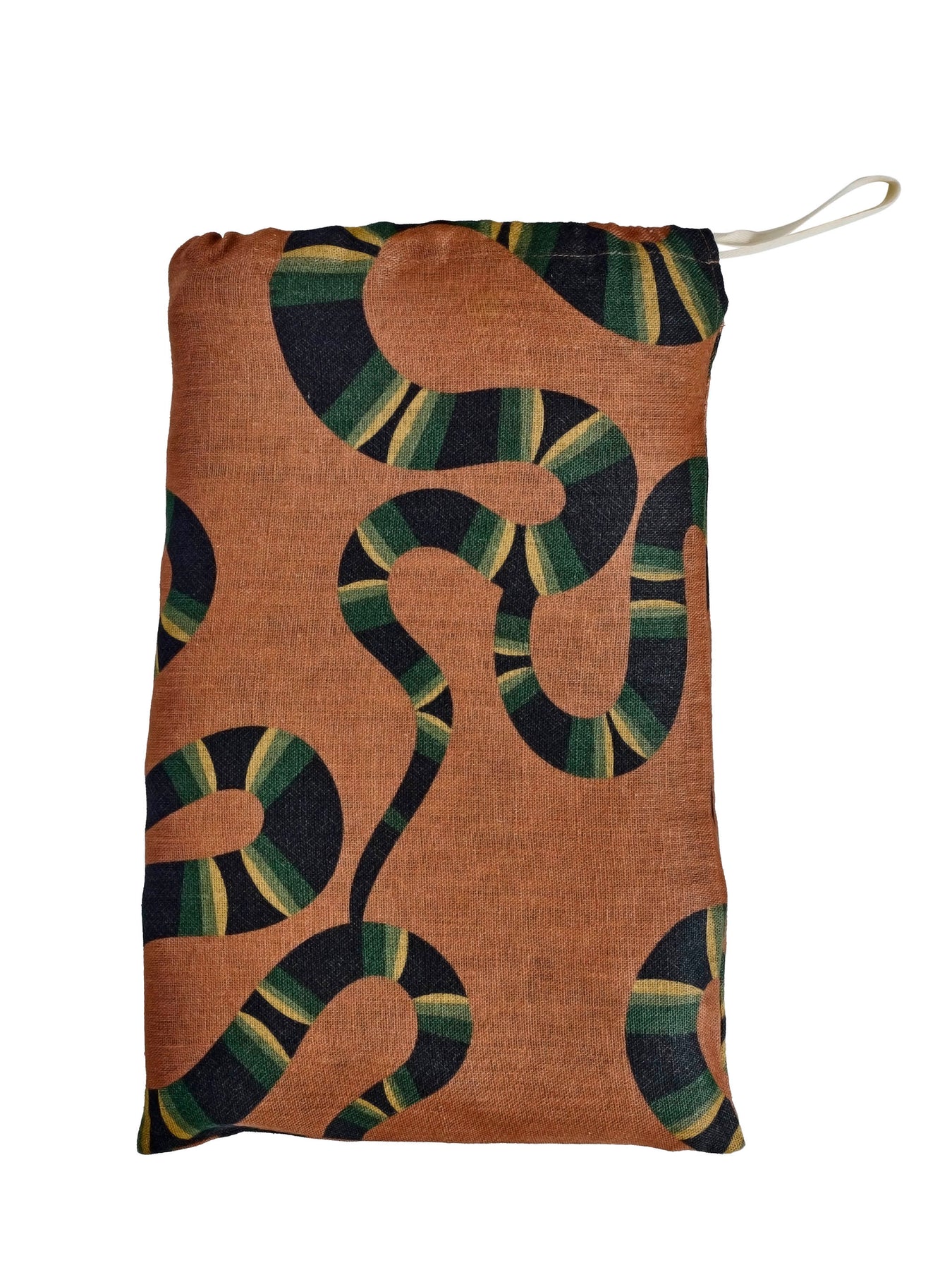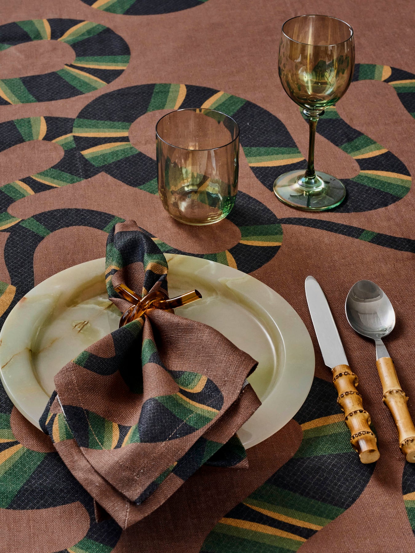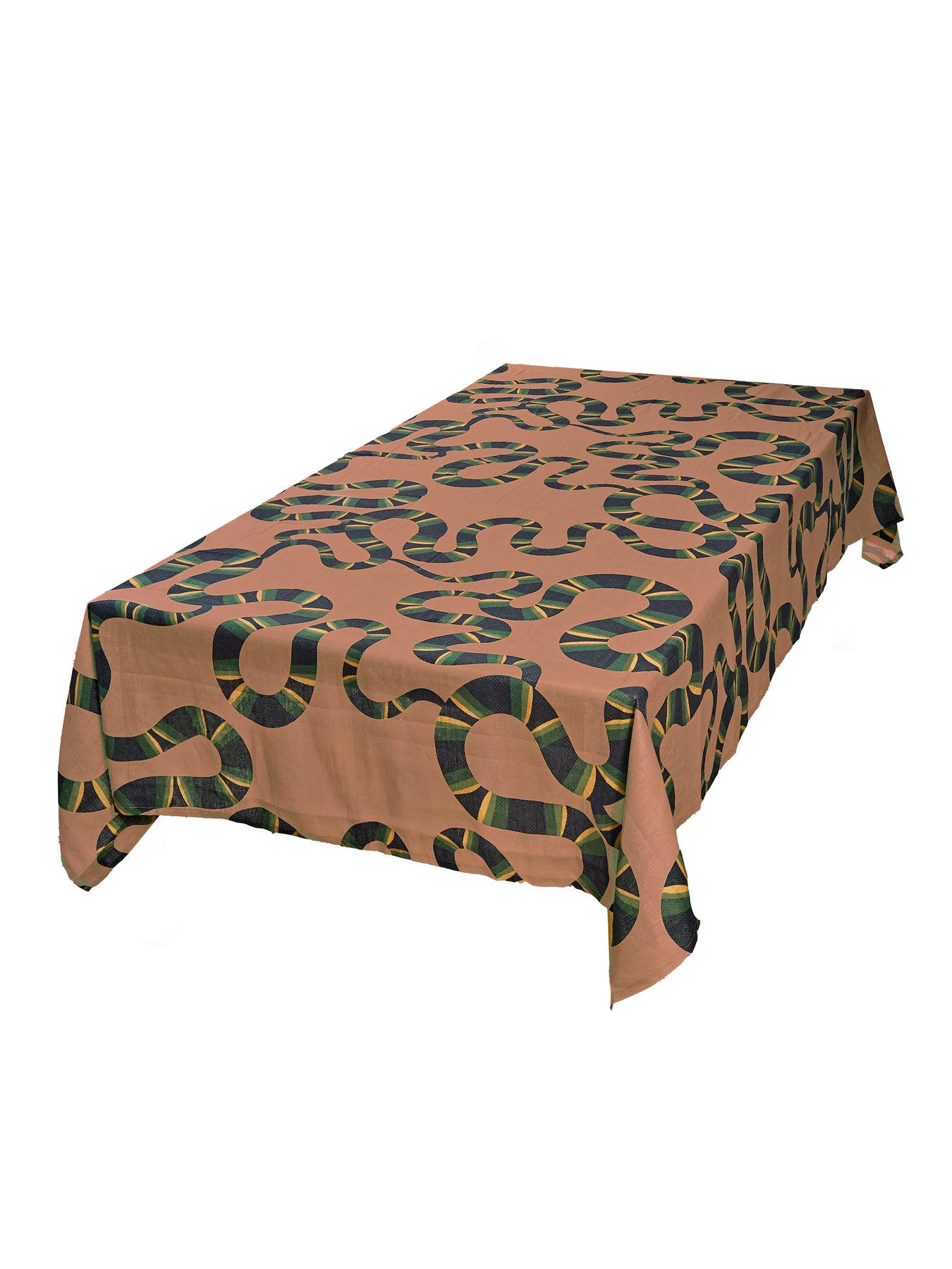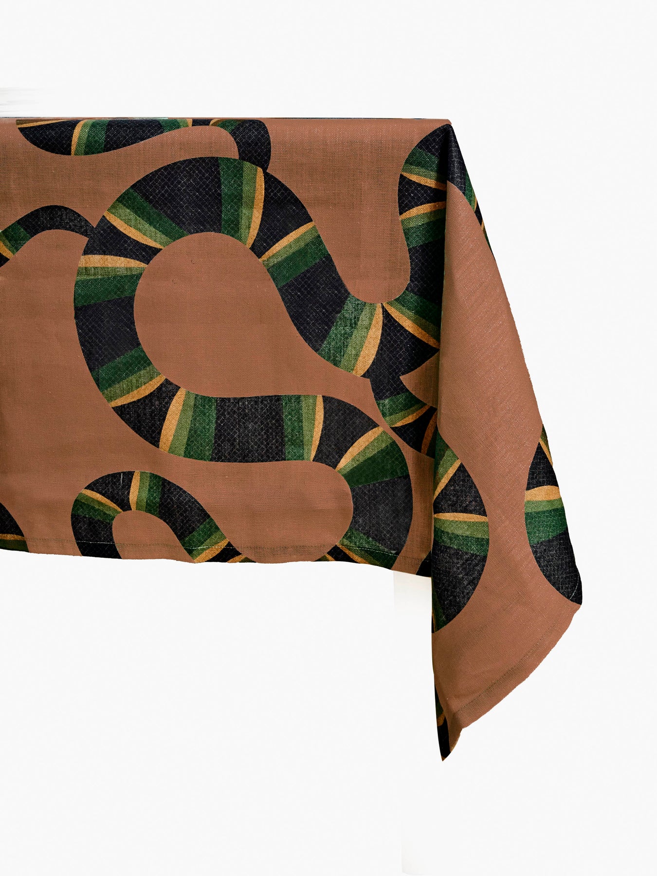 Made of 100% linen, this classic Rust tablecloth should slither onto your next table setting. Enigmatic and intuitive, the Snake symbolizes protection, regality, and wisdom. Its transformative ability to shed its skin is a metaphor for learning from mistakes and achieving rebirth. In our Naga motif, a mysterious and graceful repeating pattern of a snake's body is depicted in black (a lucky color for Snakes) and is detailed with green and yellow stripes and delicate scales. Originally introduced to celebrate the Year of the Snake, the sixth animal of the Chinese Zodiac, this collection was developed to wish you health and prosperity as you gather around the table with your family and loved ones during the new lunar year. Our collection's name derives from a class of mythical semidivine beings, half human and half serpent, in Hinduism, Buddhism, and Jainism. Nagas are often depicted as guardians of water, rain, and treasure. Discover our entire Naga Collection for coordinating tablecloths and tea towels.
