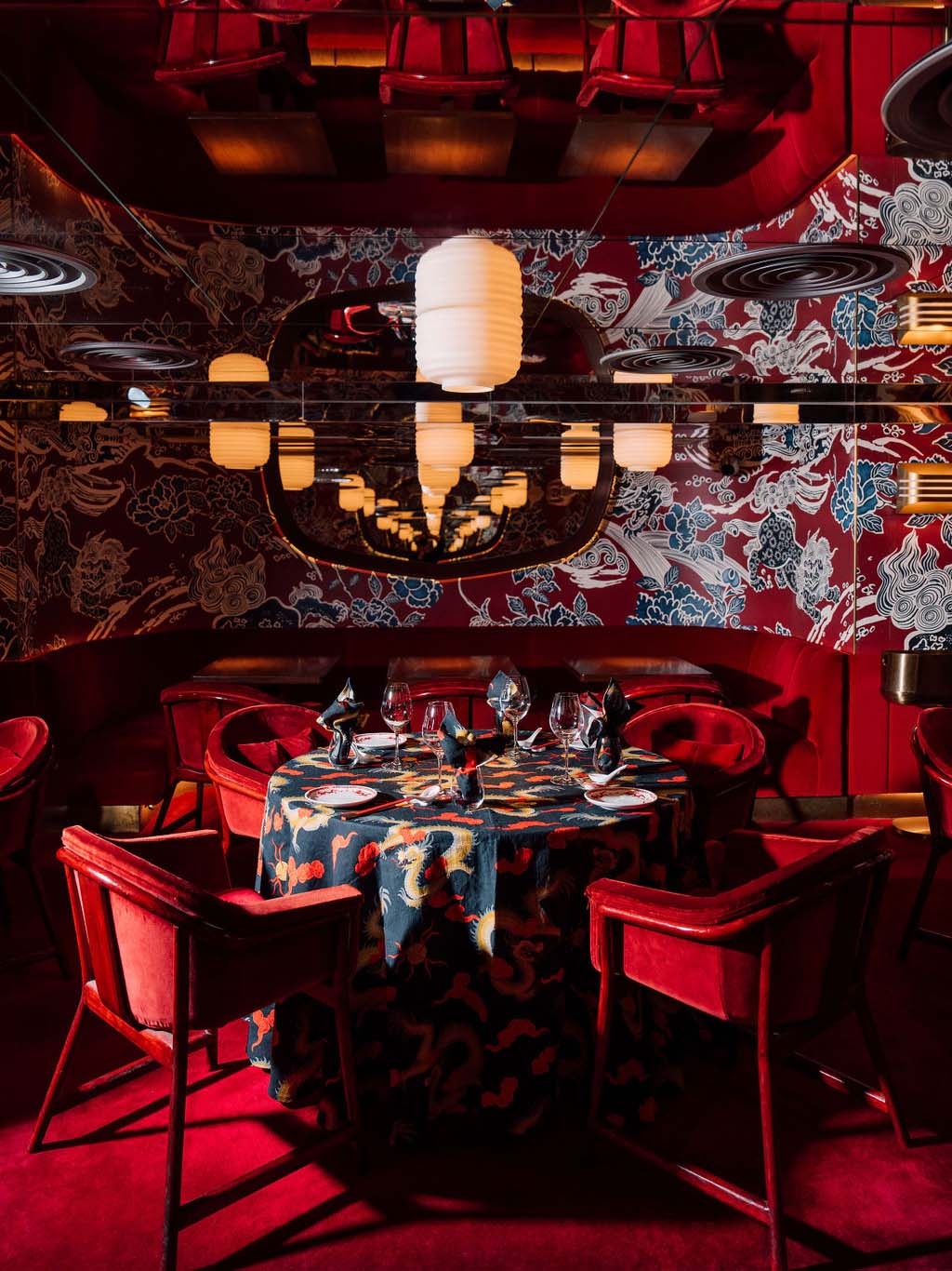 Kowloon Dragon Tablescape featuring a golden ombré dragon set against an onyx background and surrounded by red clouds, hoping to bring all good fortune and joy. Table Styles with red glass plates and Caju onyx wine glass. Linens made from organic cotton linen and GOTS Certified.