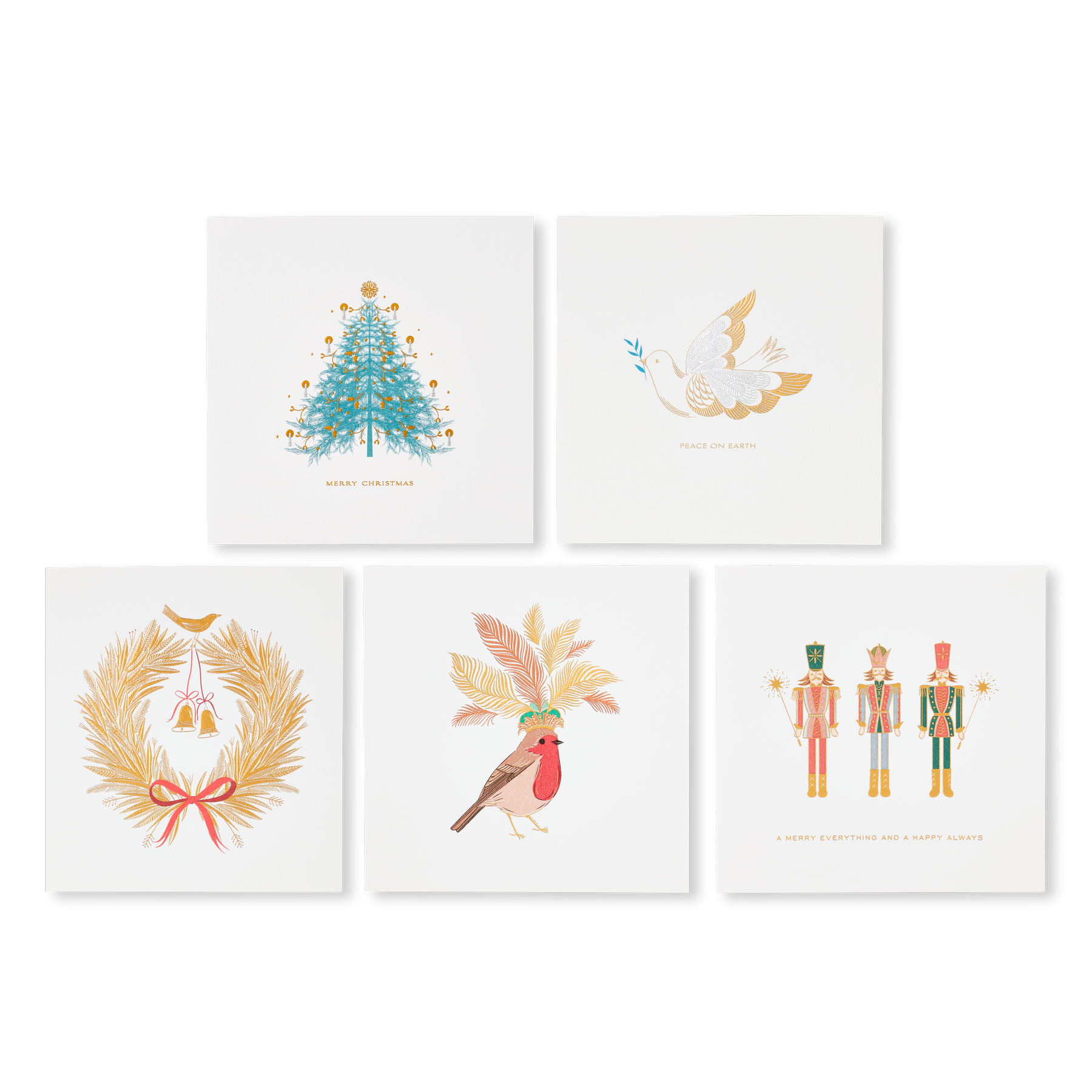 Assorted festive designs include:2 x 'Fir Tree' Christmas Card, 'Dove' Christmas Card, 'Wreath' Christmas Card, 'Robin' Christmas Card' and 'Nutcracker' Christmas Card